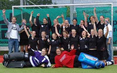 Aufsteiger in die 1. Liga Vorne v. l.: Friedericke Rosseck, Natalie Grauel Mitte v.l.: Raffaela Bethke, Verena von Weiss, Eliza Berrendorf, Elisabeth Giese, Luisa Lanier (C), Heike Golenia, Sonja Lehmann, Nora Feddersen Hinten v.l.: Dennis Grüneberg, Anke Brockmann, Sara Kleiner, Anja Preuß, Anika Tietz, Saskia Timm, Silke Stockhaus, Nadine Schmechel, Julia Grzegorski, Nicole Peter, Svenja Lange |