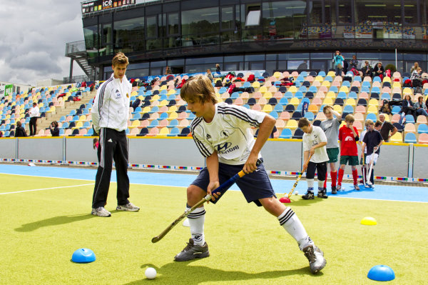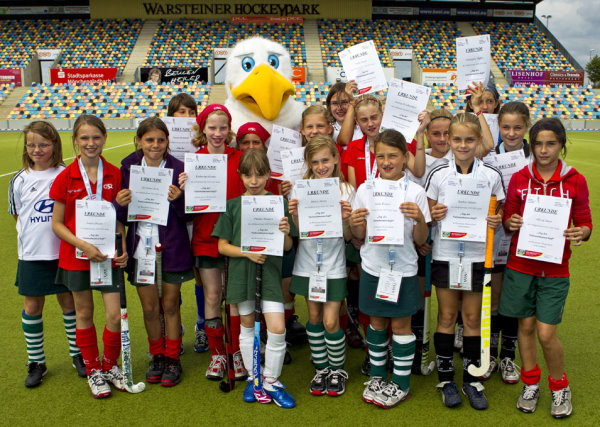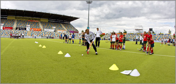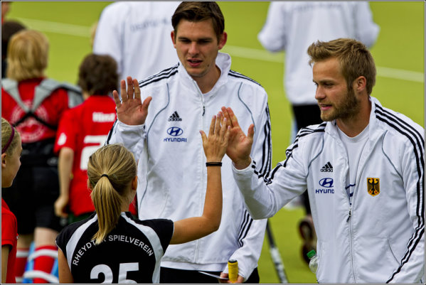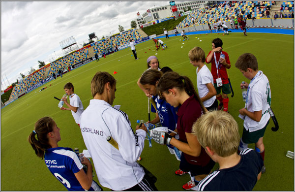Nicht nur die Nationalspieler selbst waren begeistert vom Engagement und den Fähigkeiten des potenziellen Hockeynachwuchses. Auch die Zuschauer im Warsteiner HockeyPark sowie die Eltern waren überaus angetan von den Hockeystars zum Anfassen. Im Anschluss gaben die Nationalspieler auch noch eine Autogrammstunde, bei der vom EM-Plakat bis zum Hockeyschläger alles signiert wurde, was die Kids dabei hatten.