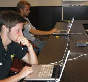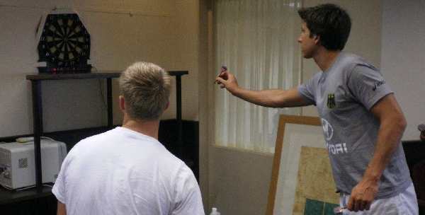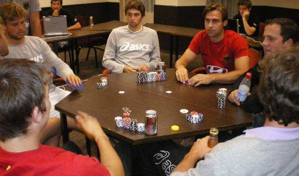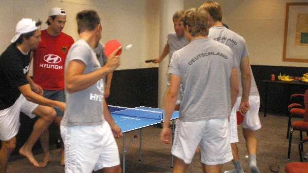 Kaum zu glauben, welcher Spaß sich beim Plattenlaufen mit 16-18 Leuten oder auch beim engagierten Einzel entstehen kann. Gar nicht so leicht mit kleinen Schlägern die kurze Platte zu treffen. Ab und zu bilden sich Pokerrunden, eine Dartscheibe hängt ebenfalls an der Wand. Gleich neben dem Teamraum wurde für die Damen und Herren gemeinsam ein Internetraum eingerichtet. Die Verbindung nach Hause und das Studium der Berichterstattung ist wichtiger Bestandteil des Tagesablaufes.