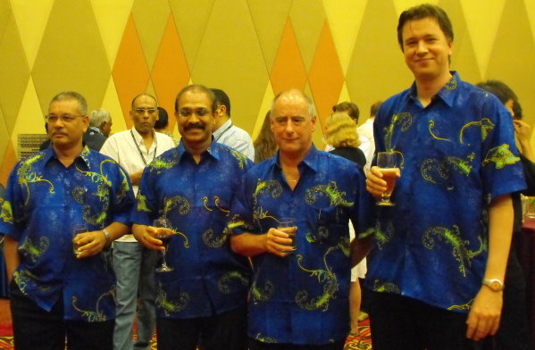Christian Deckenbrock (rechts) mit seinen Kollegen in südasiatisch farbenfroher Kluft.