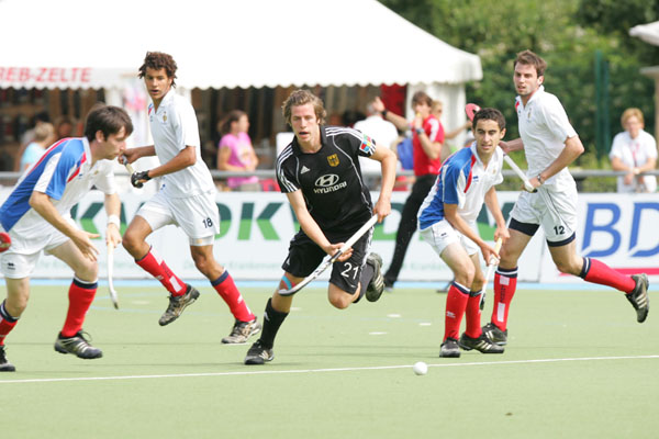 13.06.2010 - Die deutsche U21-Auswahl der Herren musste im letzten Vergleich mit Frankreichs perspektivisch aufgestelltem A-Kader die erste Niederlage hinnehmen. Beim letzten von vier Testspielen unterlag das Team von Bundestrainer Jamilon Mülders knapp mit 3:4 (2:0) und konnte dabei nicht an die vorausgegangenen Leistungen anknüpfen. Bundestrainer Jamilon Mülders: „Der Lehrgang war insgesamt gut, doch am Ende hat uns einfach die Kraft gefehlt. Obwohl wir heute verloren haben, fand ich das Spiel besser als gestern. Besonders Torwart Christopher Stubbe hat in der ersten Halbzeit, die auch die deutliche bessere war, überragend gehalten. “