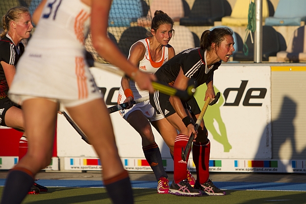 01.08.2013 - Die deutschen Hockeydamen haben ihr erstes von zwei EM-Vorbereitungsspielen im Warsteiner HockeyPark gegen Oympiasieger Niederlande nach guter Partie mit 1:3 verloren. Beide Teams investierten bei großer Hitze viel, wobei die erste Hälfte durchaus ausgeglichen verlief, bis die Deutschen durch ein Eigentor und einen unnötigen Siebenmeter kurz vor der Pause in Rückstand gerieten. Den Niederländerinnen gehörten dann große Teile der zweiten Halbzeit. Sie bauten ihre Führung auf 3:0, doch das große Engagement der Deutschen wurde zumindest noch mit dem 1:3 durch Lena Jacobi belohnt.