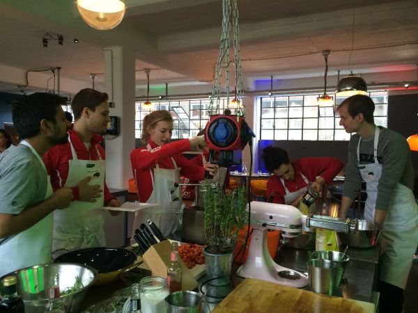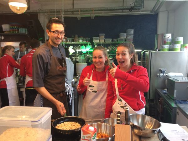 19.01.2016 - Einen Tag vor Abflug nach Minsk zur Hallen-EM der Damen hat das DHB-Hallenteam am Mittag eine fröhliche Teambuilding-Maßnahme absolviert. Beim Event-Caterer Ketao in Frankfurt-Riederwald kochten die zwölf Spielerinnen und der Staff gemeinsam unter Anleitung der Kochschul-Profis ihr Mittagessen. Zutaten mussten vorher selbst besorgt werden. Das Rezept gab es von der Ketao-Crew vorgegeben. Offenbar hatten die Team-Mitglieder nicht nur jede Menge Spaß bei Der Aktion, sondern es soll auch gut geschmeckt haben.
