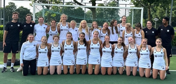 Die deutsche WU18 in Arnheim. Von links, kinten: Athletiktrainer Benjamin Linke, Physio Sören Gnoss, Johanna Warnecke, Maxi Green, Annasophia Möller, Janne Dreyer, Mai Steinebach, Lucia Rahm, Charlotte Rehmet, Luisa Zuther, Franziska Pabsch, Rosa Kunze, Hannah Groh, Bundestrainerin Corinna Zerbs, Co-Trainer Darren Cheesman; vorne: Franziska Hagen, Annika Schönhoff, Marisa Fahning, Lucy Zich, Marie Buddenberg, Fenna Utesch, Emma Knörndel, Emma Dieszbrock Greta Köllinger, Madita Niebuhr, Victoria Käske. Dazu gehören auch Emelie Tödter und Teammanagerin Michaela Scheibe.