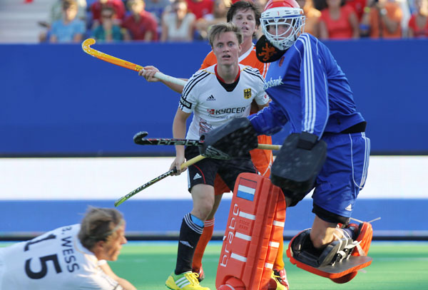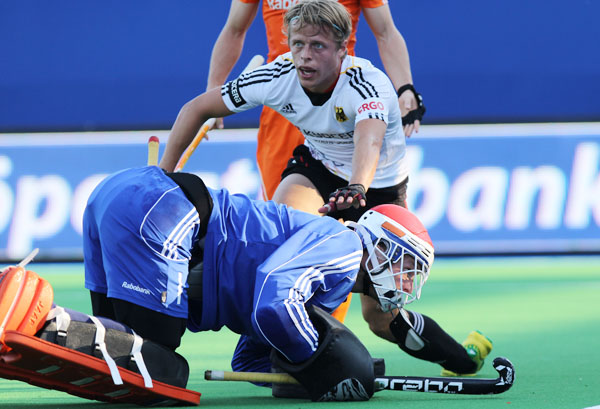 Vor dem Halbfinale wurde im deutschen Team Martin Zwicker durch DHB-Präsident Stephan Abel für seinen 100. Länderspieleinsatz geehrt. Nach Anpfiff nutzte Deutschland gleich eine Unordnung in der Defensive der Oranjes, als Stralkowski frei in den Kreis laufen konnte und schoss, aber ein Stecherversuch blieb erfolglos. Kurz darauf erneut das DHB-Team beinahe erfolgreich: Fuchs prüfte Jaap Stockmann und Stralkowski hätte am Pfosten beinahe den Volley reindrücken können (3.). Das DHB-Team mit den klareren Chancen.