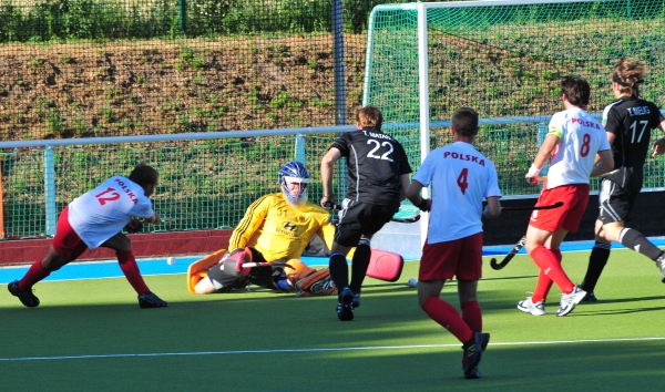 In der ersten Halbzeit hatte das deutsche Team schon deutlich mehr vom Spiel, machte sich die Chancen aber zumeist selbst zunichte, weil der letzte Pass im Kreis nicht akkurat genug gespielt wurde. Bei den Ecken hatte das Team ungewohnte Probleme in der Ausführung – was aber auch daran lag, dass man sich noch mit dem Platz vertraut machen musste. So kam es etwas überraschend, dass die Polen kurz vor der Pause in Führung gingen, als Artur Mikula von einem der wenigen Fehler in der deutschen Abwehr profitierte und zum 0:1 (35.) traf.
