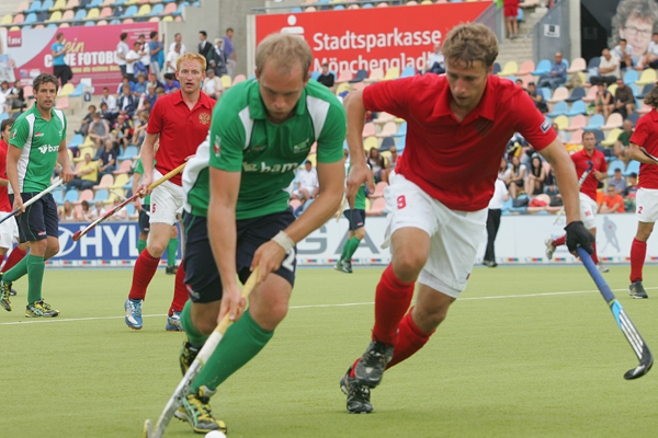 26.08.2011 - Das erste Match der Relegationsrunde zwischen Irland und Russland entwickelte sich von Beginn an zu einer einseitigen Angelegenheit. Die bereits mit drei Punkten ausgestatteten Iren nahmen das Heft in die Hand und setzten Russland mit Tempohockey und Pressing unter Druck. Logische Folge waren drei schnelle Tore von Michale Watt, Michael Darling und Eugene Magee in den ersten 25 Minuten.