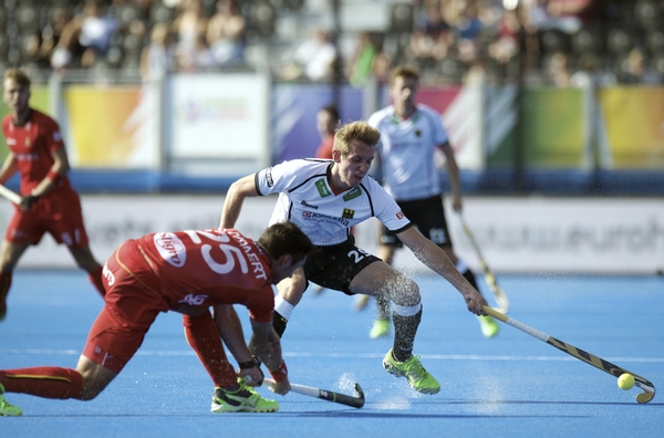 22.08.2015 - Die deutschen Herren haben ihr Auftaktspiel bei der EM in London gegen Belgien klar mit 4:0 (0:0) gewonnen. Vor 4.500 Zuschauern war es lange ein spannendes Match, in dem mal das eine, mal das andere Team Vorteile hatte. Schlüssel zum Erfolg war die starke Abwehr- und Torwartleistung. Nicolas Jacobi hielt alle Strafecken der Belgier und war auch aus dem Feld heraus nicht zu bezwingen. Niklas Wellen (2), Constantin Staib und Florian Fuchs trafen in den letzten 18 Minuten für das DHB-Team. Am morgigen Sonntag um 21.30 Uhr (dt. Zeit, live bei Sport1) folgt das zweite Match gegen Irland.