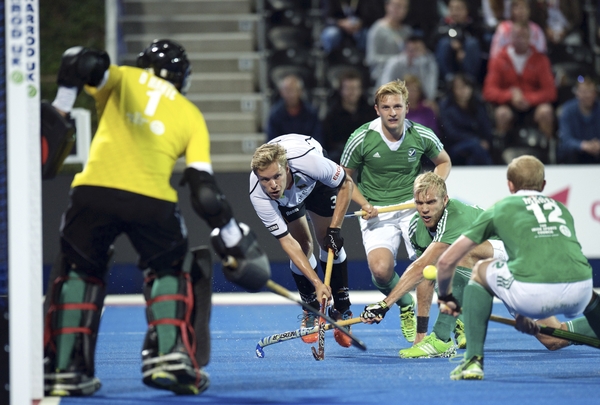Die nächste Chance kam wieder per Strafecke – und diesmal schlug der Ball ein. Lukas Windfeder traf mit seinem Flachschlenzer unten links zur verdienten Führung (54.). Die Iren antworteten mit ein, zwei wilden Angriffen, sodass Nicolas Jacobi zwei Mal gegen Jonathan Bruton stark parieren musste (55. und 56.). Die Vorentscheidung aber brachte Florian Fuchs. Der Stürmer holte sich den Ball links an der Mittellinie, ließ drei Verteidiger stehen, spielte den Keeper aus und schoss aus der Mitte locker zum 2:0 ein (56.). Marco Miltkau hätte auch noch gern einen Treffer erzielt, aber sein ebenso trockener wie harter Schuss von halbrechts traf nur Keeper David Harte (59.).